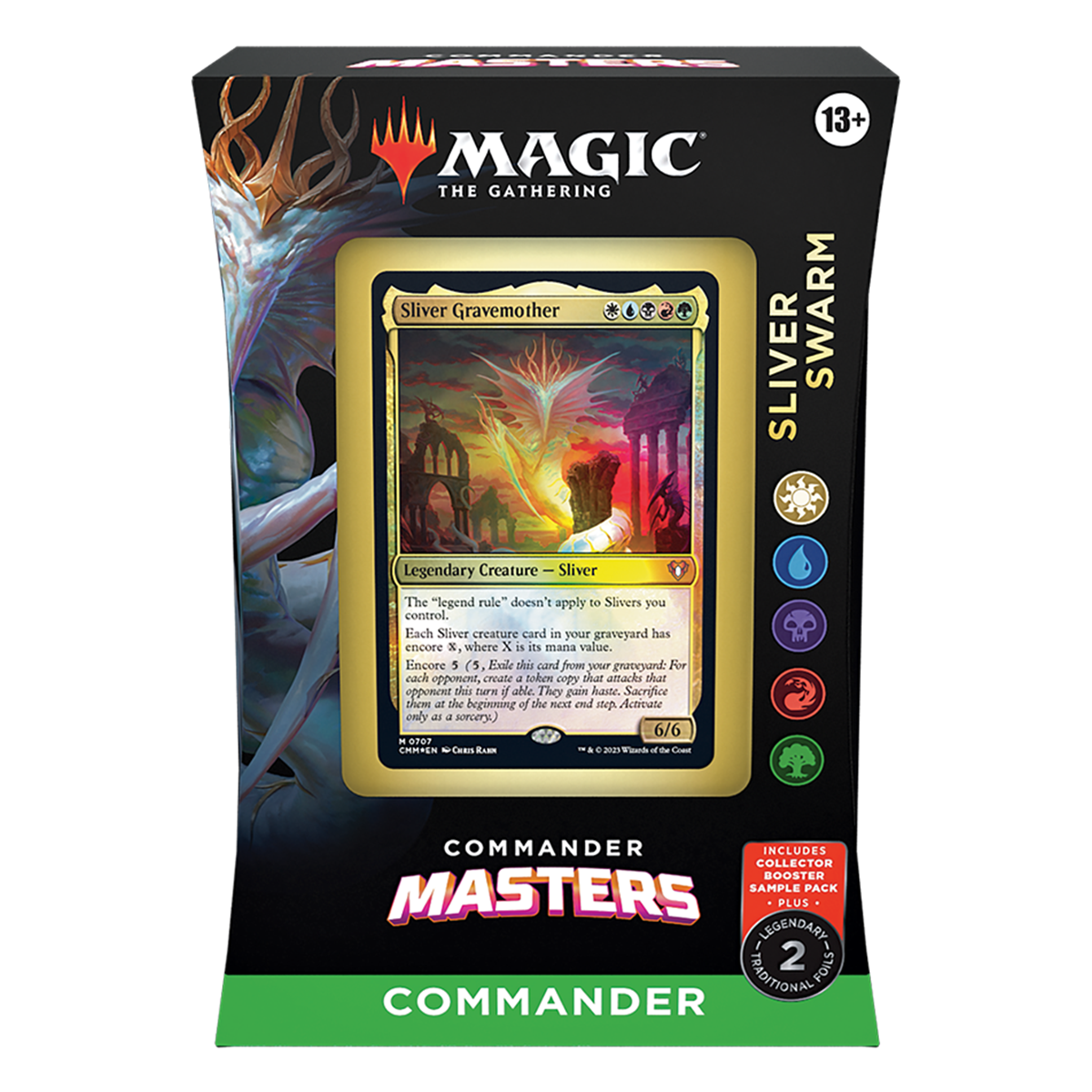 Each Commander Masters Commander Deck set includes 1 ready-to-play deck of 100 Magic cards (2 Traditional Foil Legendary Creature cards, 98 nonfoil cards), a 2-card Collector Booster Sample Pack, 1 foil-etched Display Commander (a thick cardstock copy of the commander card with foil etched into the card’s border and art), 10 double-sided tokens, 1 deck box (can hold 100 sleeved cards), 1 Life Wheel, 1 strategy insert, and 1 reference card.