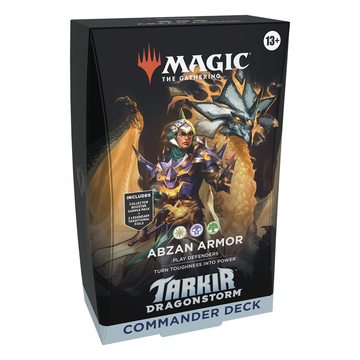Battle your friends with powerful creatures and spectacular spells in Commander, Magic’s most popular multiplayer format. Challenge your friends or try each unique playstyle with this bundle of all 5 Tarkir: Dragonstorm decks— Abzan Armor, Jeskai Striker, Sultai Arisen, Mardu Surge, and Temur Roar. Each 100-card deck contains 98 nonfoil cards and 2 Traditional Foil Borderless Legendary cards. Each deck also comes with a 2-card Collector Booster Sample Pack (contains 1 Traditional Foil or nonfoil alt-border card of rarity Rare or higher and 1 Traditional Foil Uncommon card), 10 double-sided tokens, 1 deck box (can hold 100 sleeved cards), 1 strategy insert, and 1 reference card.