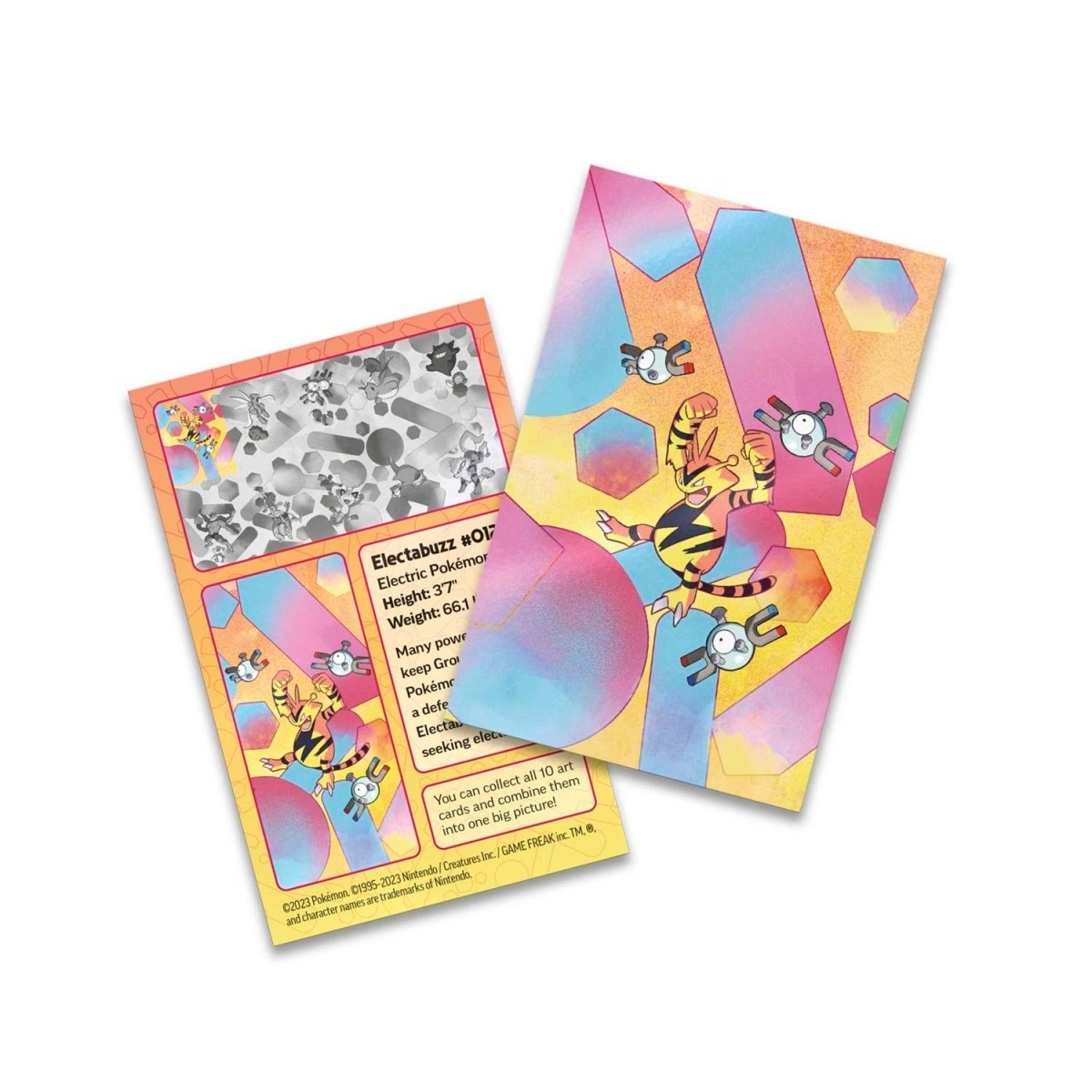 Expand your collection with this Pokémon TCG: Scarlet & Violet—151 Mini Tin, perfectly sized for taking your favourite cards on the go! This fantastic tin is easy to open and features Electabuzz and Magnemite in one of 10 fun Pokémon illustrations—and all 10 form a single image when you line them up!